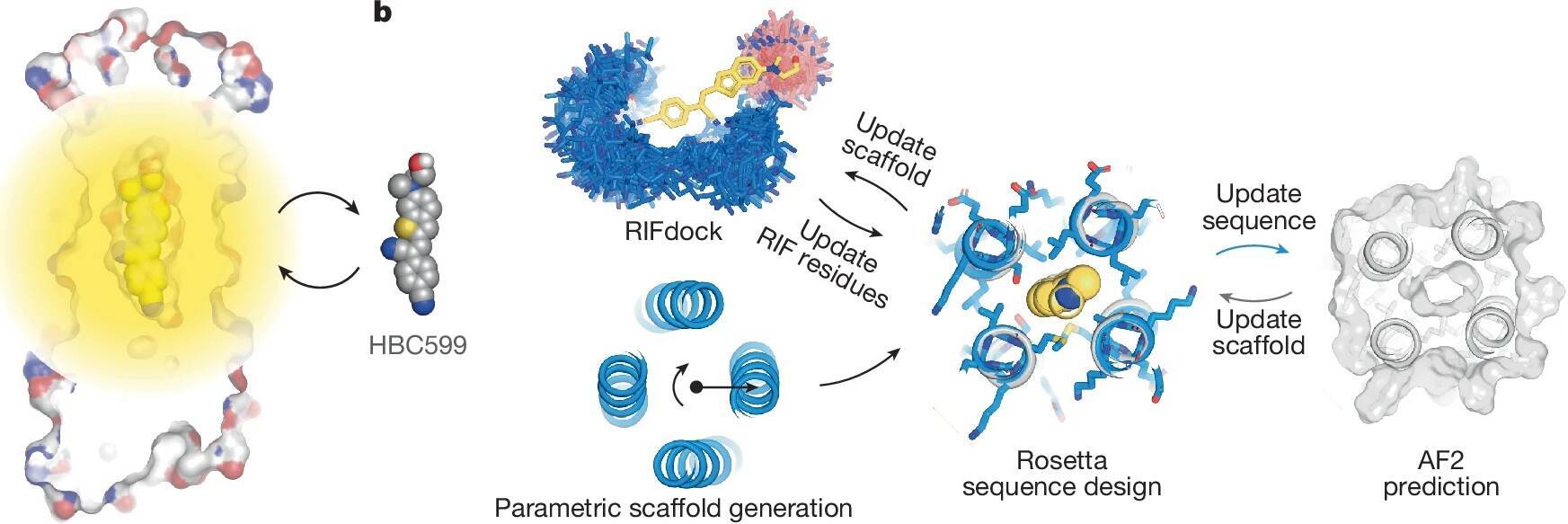 The researchers generated compact, four-bundle-based protein scaffolds and explored the design space to create pockets for HBC. The optimal pocket would be able to tightly bind the ligand and change its conformation!