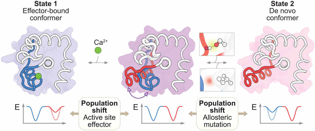 But the MD simulations were even more interesting. They observed transition between the two states on a low microsecond scale, similar to natural systems. In addition, with calcium bound, the protein stayed in state 1, showing orthosteric stabilization (when the stabilization comes from binding within the region of conformational change). The MD simulations also showed that the two states are stabilized by different hydrophobic interactions and hydrogen bonds, explaining the experimental findings!