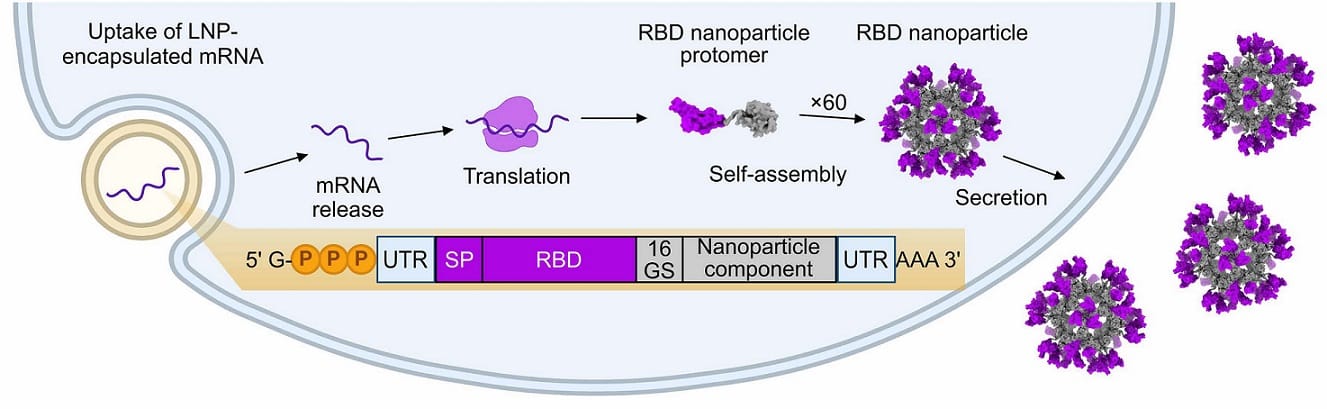 So, the team designed an mRNA sequence that encodes a multivalent, self-assembling nanoparticle, secreted and assembled by host cells!
